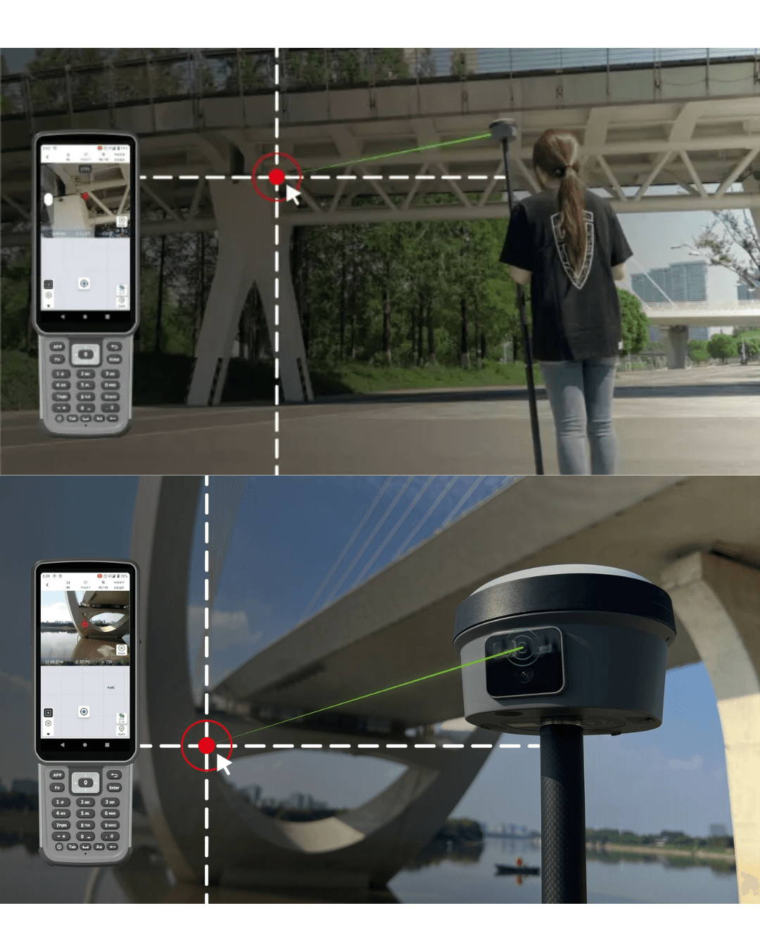 Cámaras duales de 2MP para documentación automática: La cámara frontal y la inferior capturan fotografías de cada punto medido, asociándolas automáticamente a las coordenadas. Valioso para peritajes (evidencia visual de cada vértice), levantamientos de servicios (documentar la superficie antes de excavación), patrimonio (la fotografía complementa la coordenada 3D) o prevención de errores (verificar en oficina que el punto corresponde al elemento previsto).